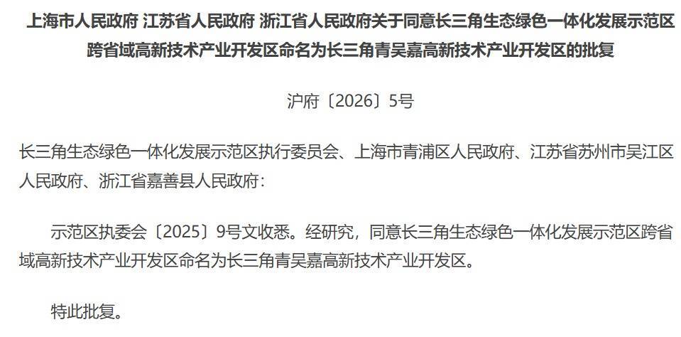 近日股票配资平台官网入口,上海市人民政府、江苏省人民政府、浙江省人民政府批复,同意长三角生态绿色一体化发展示范区跨省域高新技术产业开发区命名为长三角青吴嘉高新技术产业开发区。